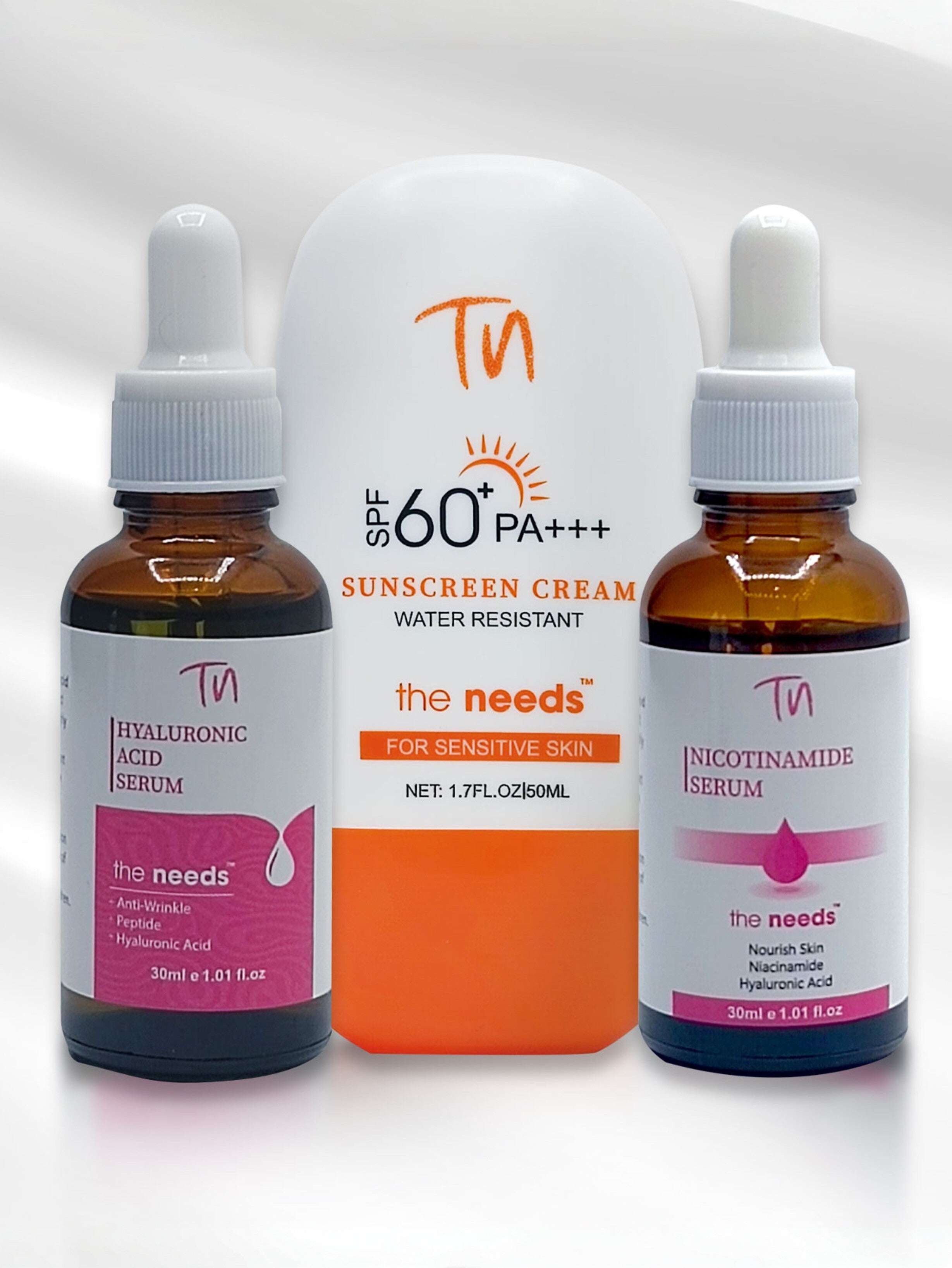 The Needs' Hydration & Glow Trio is your one-stop skincare solution. This potent set is formulated to intensely hydrate, illuminate your complexion, and shield your skin from the sun. With three must-have products—Hyaluronic Serum, Nicotinamide Serum, and Sunscreen SPF 60+—this trio replenishes your skin's natural glow while addressing dryness, dark spots, uneven tone, and aging signs.