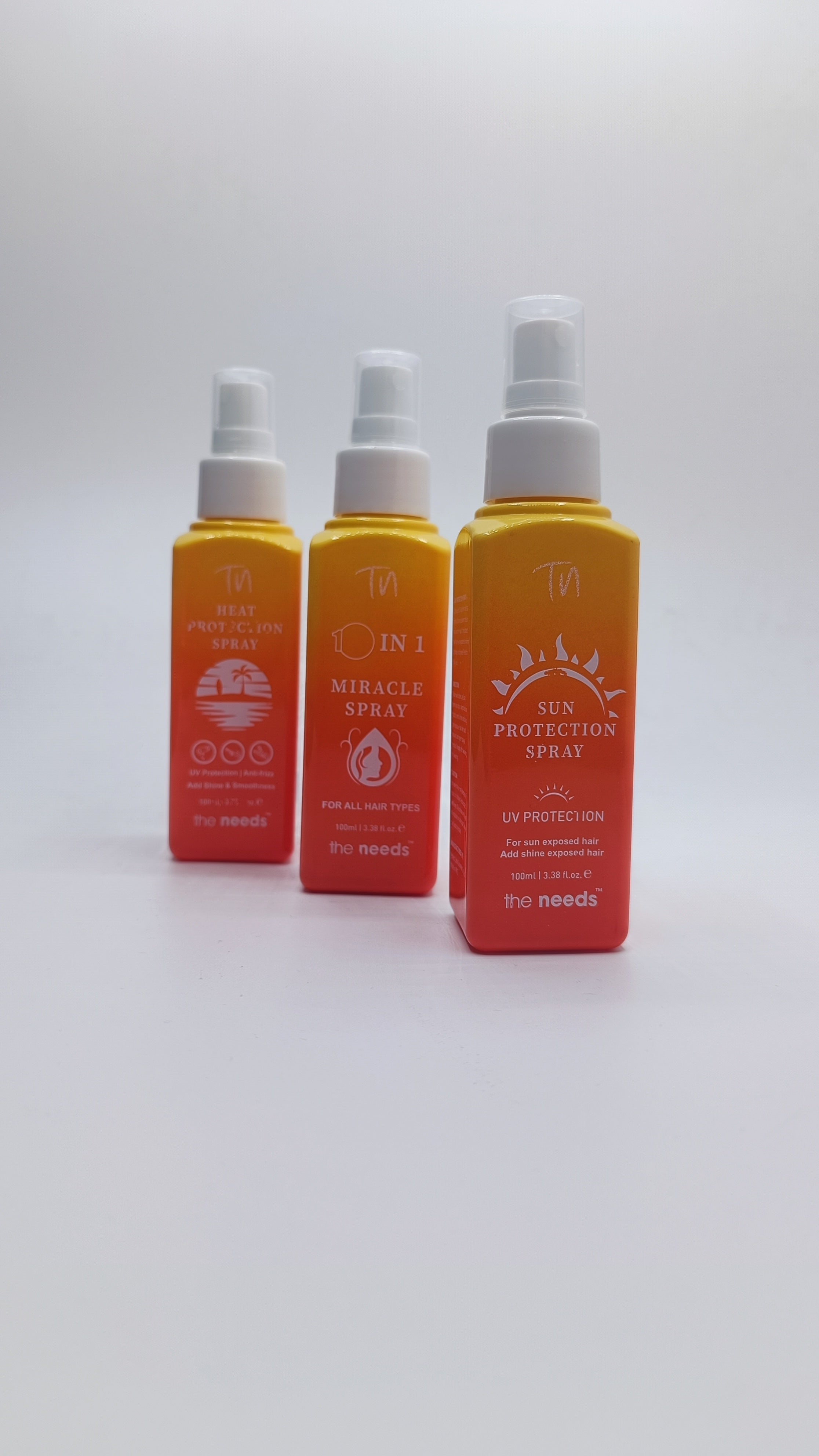 The Hair Care Must-Haves Bundle by The Needs is your all-inclusive trio for silky, shiny, and shielded hair. This must-have kit includes three potent sprays that work to address sun damage, heat styling, frizz, and dryness—all in a simple routine. Whether you're in the sun or styling at home, this bundle has your hair from root to tip.